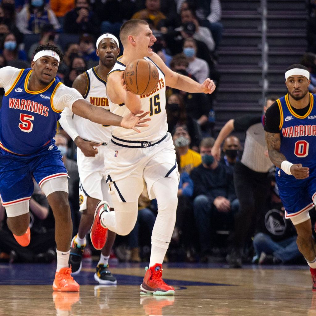 Nuggets MVP candidate Nikola Jokic (15, white) will be the deciding factor on how well the Nuggets can counter and push for a second round entry v. the Warriors. Kevon Looney (5, blue) is one of four players to play in all 82 games this season.