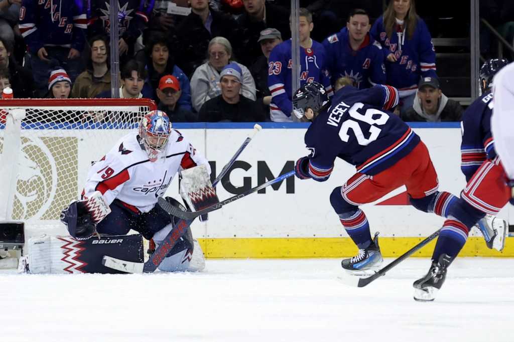 Jimmy Vesey and the Rangers offense will give Washington’s defense and Charlie Lindgren (79, white) problems.