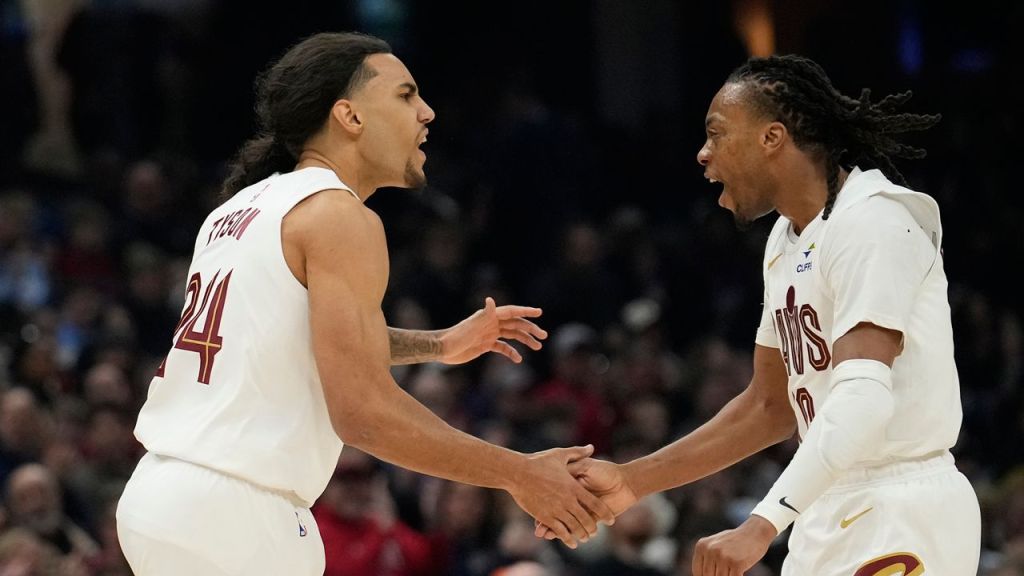Guards Jaylon Tyson (left) and Darius Garland (right) celebrate during a thrashing of Phoenix on January 20th.